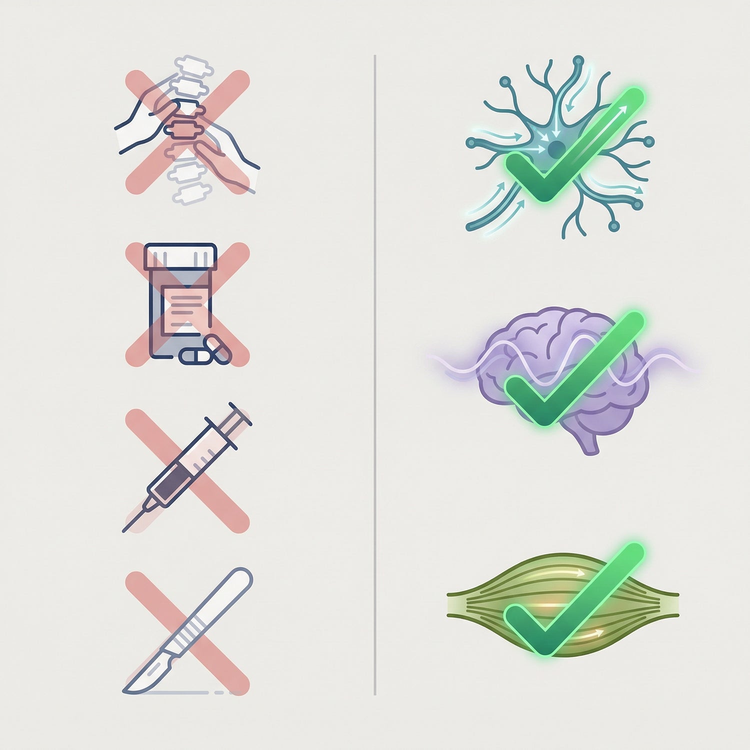 Surgery = Removes the structural compression (but doesn't address why 40% of patients still have pain afterward — their nervous system is still sensitized)
